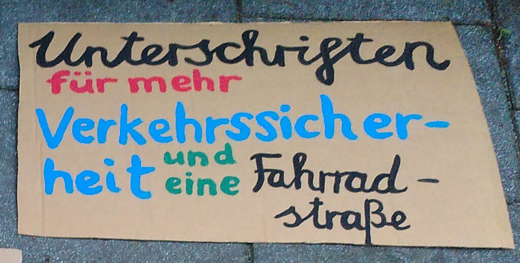 Übrigens: Die Unterschriftensammlung für mehr Verkehrssicherheit und eine Fahrradstraße wird beim Klimastreik am 23. September 2022 im Rasteder Rathaus abgegeben. Wir berichten euch, wie es damit weiter geht.
