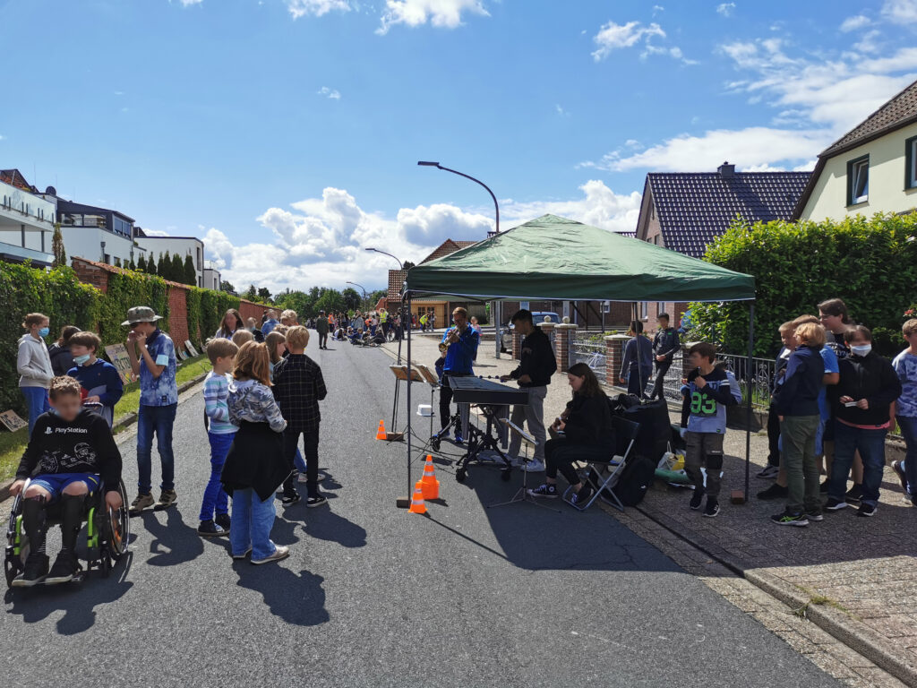 62 545 – das ist die Zahl der meldepflichtigen Schulwegunfälle Deutschlands im Jahr 2021. Der Weg zur Schule ist also durchaus gefährlich, auch bei uns in Rastede. Besonders in der Feldbreite geraten Radfahrer*innen und Fußgänger*innen seit Jahren immer wieder in bedrohliche Situationen. „Solange nicht alle Menschen ihre Alltagswege sicher mit dem Rad oder zu Fuß bewältigen können, wird es nichts mit der Verkehrswende vor Ort“, betont Bele Dietrich, eine Fridays-For-Future-Aktivistin.  Daher haben sich Schüler*innen der KGS zusammen mit dem ADFC Ammerland eine Lösung für dieses Problem überlegt. Ihr Entschluss: Die Verkehrssicherheit muss endlich verbessert werden und eine Fahrradstraße muss her! Genau darum ging es dann auch am 13.06.22 bei der Aktion „Schul- und Kinderstraße“. Wo sonst zu Spitzenzeiten regelrechtes Chaos herrscht, gab es im Bereich Einfahrt REWE bis Buschweg vielfältige Angebote zu den Themen klimafreundliche Mobilität und Verkehrssicherheit für Fußgänger*innen und Radfahrer*innen. Die Besucher*innen erwarteten eine Mal- und Spielstraße, eine mobile Fahrradwerkstatt, ein Kuchenbasar, eine Speaker’s Corner, ein Quiz zur Verkehrssicherheit und eins zur Verkehrswende, Livemusik, ein Barfußpfad statt Asphalt und vieles mehr.