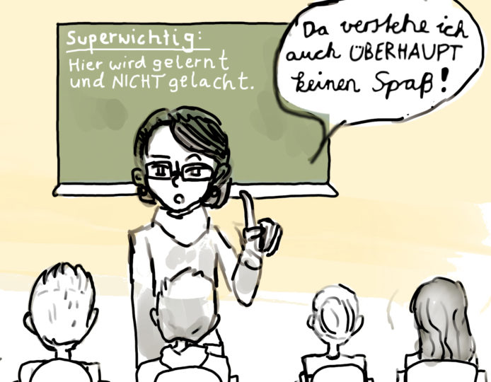 Viele Schüler*innen haben bei der Ideensammlung geholfen und skurrile Begebenheiten aus ihrem Schüler*innenalltag berichtet. Das Tafelverhalten einer fröhlichen Französischlehrerin traf auf allgemeine Begeisterung und wurde von Ronja in einer Freistunde mit viel Liebe zum Detail zu Papier gebracht.