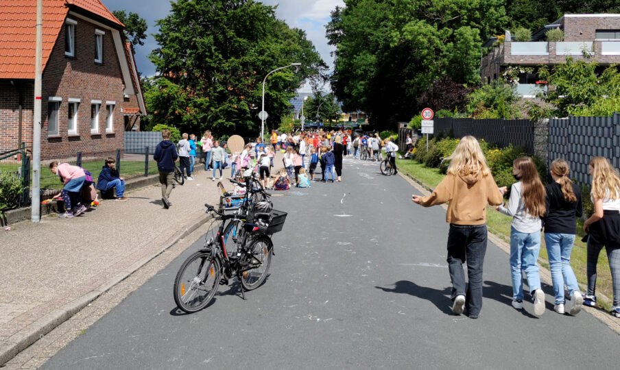 „Macht doch, was ihr wollt! Denn die Feldbreite wird bis 14.30 Uhr von REWE bis zum Buschweg gesperrt“ – das war am 13. Juni 2022 das Motto der Aktion „Schul- und Kinderstraße“ in der Feldbreite. Die Kinder der beiden Kindergärten, der Grundschule Feldbreite und die Schüler*innen der KGS sowie alle Anderen konnten die autofreie Straße nach Lust und Laune nutzen. Eingeladen dazu hatten der ADFC Ammerland, Fridays For Future Rastede und die Schüler*innenvertretung der KGS, um ein Zeichen für mehr Verkehrssicherheit auf dem Weg zu Kita und Schule zu setzen.