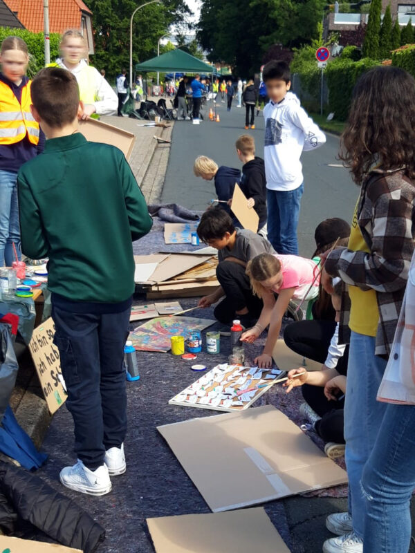 62 545 – das ist die Zahl der meldepflichtigen Schulwegunfälle Deutschlands im Jahr 2021. Der Weg zur Schule ist also durchaus gefährlich, auch bei uns in Rastede. Besonders in der Feldbreite geraten Radfahrer*innen und Fußgänger*innen seit Jahren immer wieder in bedrohliche Situationen. „Solange nicht alle Menschen ihre Alltagswege sicher mit dem Rad oder zu Fuß bewältigen können, wird es nichts mit der Verkehrswende vor Ort“, betont Bele Dietrich, eine Fridays-For-Future-Aktivistin.  Daher haben sich Schüler*innen der KGS zusammen mit dem ADFC Ammerland eine Lösung für dieses Problem überlegt. Ihr Entschluss: Die Verkehrssicherheit muss endlich verbessert werden und eine Fahrradstraße muss her! Genau darum ging es dann auch am 13.06.22 bei der Aktion „Schul- und Kinderstraße“. Wo sonst zu Spitzenzeiten regelrechtes Chaos herrscht, gab es im Bereich Einfahrt REWE bis Buschweg vielfältige Angebote zu den Themen klimafreundliche Mobilität und Verkehrssicherheit für Fußgänger*innen und Radfahrer*innen. Die Besucher*innen erwarteten eine Mal- und Spielstraße, eine mobile Fahrradwerkstatt, ein Kuchenbasar, eine Speaker’s Corner, ein Quiz zur Verkehrssicherheit und eins zur Verkehrswende, Livemusik, ein Barfußpfad statt Asphalt und vieles mehr.