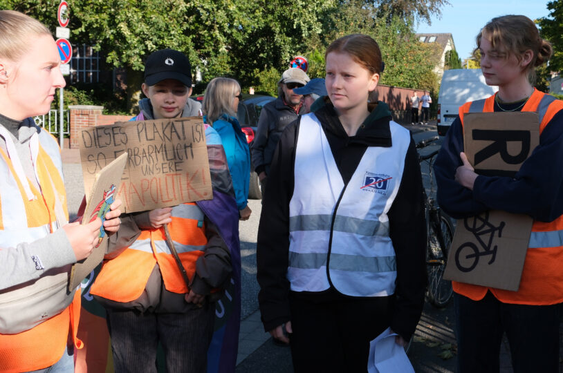 🔺 Der nächste Schritt ist die Organisation von Ordner*innen, die die Demo vom Straßenverkehr abgrenzen und dafür sorgen, dass alles gut verläuft. Aktuelle und ehemalige Schüler*innen sowie Unterstützer*innen von Gruppen wie Rastede For Future, W.I.M, NABU Rastede und ADFC Ammerland helfen dabei mit. Ordner*innen müssen mindestens 16 Jahre alt sein.